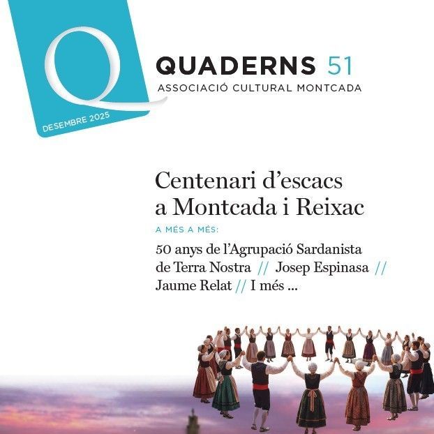 El dijous 18 de desembre, a les 18.30h, al local de l'Associació es presentarà el número 51 de la nostra revista Quaderns que inclou articles sobre el centenari dels escacs a Montcada i el 50é aniversari de l’Agrupació Sardanista de Terra Nostra; i també sobre el primer alcalde republicà de Montcada i Reixac, Josep Espinasa, o sobre la trajectòria del montcadenc Jaume Relat, entre d’altres.